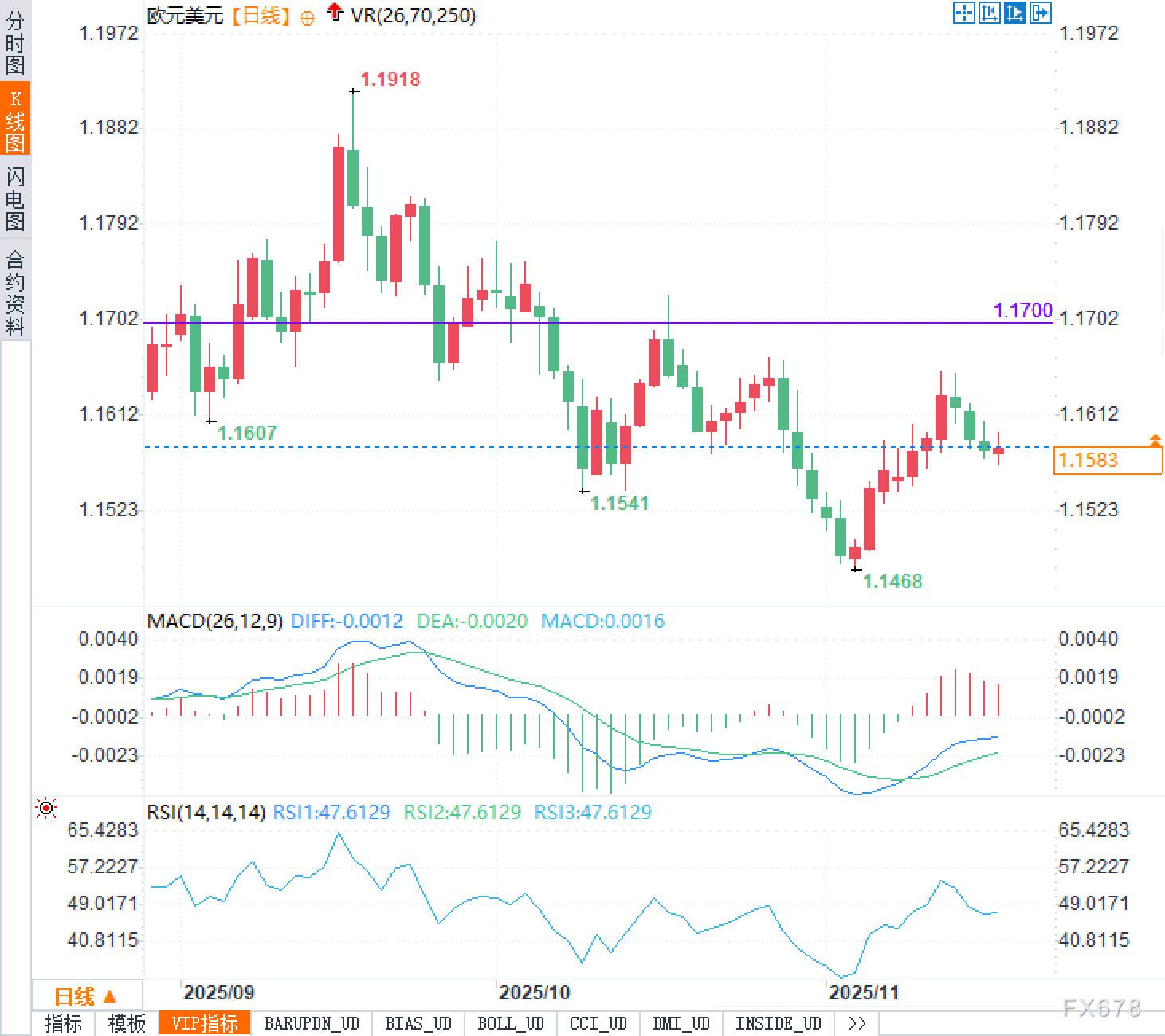 然而,近期影响欧元兑美元的,并非仅仅是利率与通胀的基本面,而是宏观与风险情绪的叠加结果。一方面,市场对美联储在12月降息的预期略有升温,体现出对美国经济动能放缓的担忧;另一方面,全球股市近期的抛售,明显强化了避险情绪。在风险偏好降温的环境下,美元作为传统避险货币受到资金青睐,资金在股票和部分高风险资产中减仓的同时,加大了对现金与高流动性工具的配置。这种“避险型美元买盘”在短期内往往可以压过利率预期走弱的负面影响,使美元指数在高位维持强势,也使欧元兑美元在1.16下方承压整理。